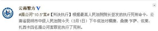 【判决执行】根据最高人民法院院长签发的执行死刑命令,云南省昆明市中级人民法院今天(3月1日)下午依法对糯康、桑康·乍萨、依莱、扎西卡四名湄公河案罪犯执行了死刑。