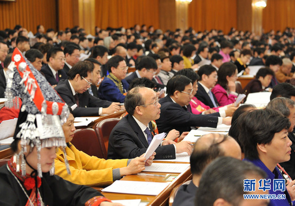 3月5日,第十二届全国人民代表大会第一次会议在北京人民大会堂开幕。图为周国辉代表(左三)在听取报告。新华社记者 黄敬文摄