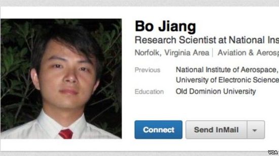 法庭传唤书上显示,被捕的中国公民江波(Bo Jiang 音译)出生于1981年11月27日是成都人,居住在华盛顿近郊的弗吉尼亚州诺福克市。江波身高1米65,体重140磅,曾以合同制形式受雇于美国国家航空航天局设在华盛顿近郊的兰利研究中心。根据职业社交网站Linkedin上的个人资料显示,江波曾是美国国家航空研究院(National Institute of Aerospace)的研究员,曾就读于中国电子科技大学和美国奥多明尼昂大学(Old Dominion University)大学。