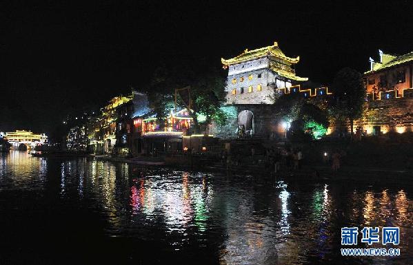 2012年9月4日晚拍摄的凤凰古城夜色。湖南省湘西土家族苗族自治州凤凰古城被誉为“中国最美丽的小城”之一,也是中国历史文化名城。凤凰古城的晨昏和夜晚光影迷离,沱江两岸的石板路,古香古色的吊脚楼,吸引众多海内外游客来此参观游览。新华社记者赵众志摄