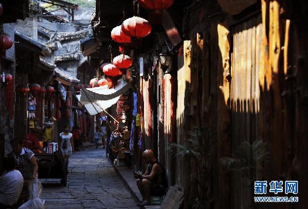 2012年9月5日拍摄的凤凰古城的一条老街。湖南省湘西土家族苗族自治州凤凰古城被誉为“中国最美丽的小城”之一,也是中国历史文化名城。凤凰古城的晨昏和夜晚光影迷离,沱江两岸的石板路,古香古色的吊脚楼,吸引众多海内外游客来此参观游览。新华社记者赵众志摄