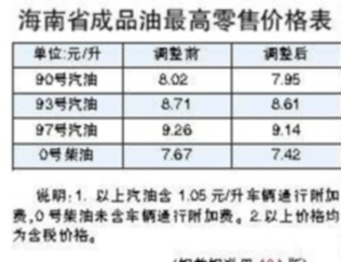 省物价局相关负责人介绍,经省政府同意,根据琼价费管〔2013〕153号文件规定,将我省汽油机动车辆通行附加费征收标准从0.90元/升调整为1.05元/升,与此次成品油价格调整同步实施。