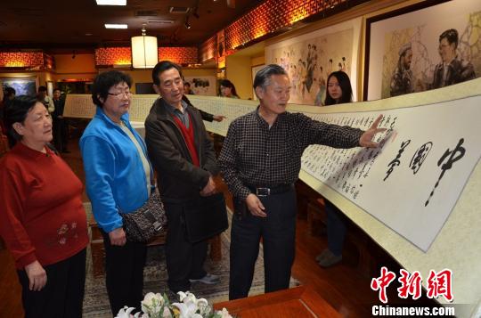 书法家赵元义在新疆国画院向市民介绍《中国梦》长卷创作情况。 魏宝山 摄