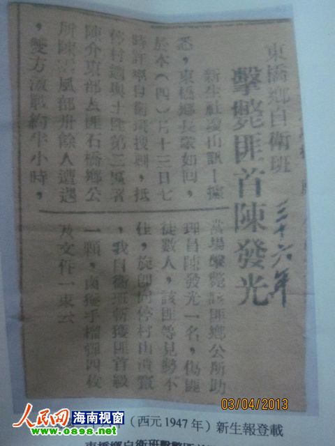这份收藏了整整66年的“报道”只有100余字,“报道”标题为《东桥乡自卫班击毙匪首陈发光》。“报道”称:“(国民党)东桥乡乡长蒙如四(回)于四月十三日七时许率自卫班搜剿,抵停村适与土匪第二区署陈介东部及匪石桥乡公所陈云风部三十余人遭遇,双方激战约半小时,当场击毙该乡公所助理员陈发光一名,伤匪徒数人……我自卫班斩获匪首一颗,虏获手榴弹四枚及文件一束云。”