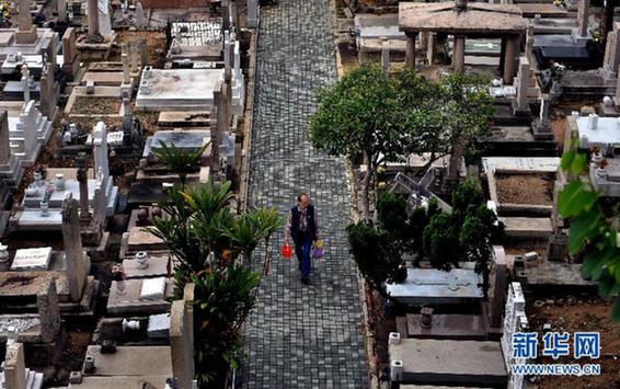 香港跑马地天主教坟场始建于19世纪40年代,根据规定,只有教徒才可埋葬于此。坟场内的建筑极具特色,随处可见天使、圣人等宗教石像。又到一年清明时节,香港市民带着鲜花、瓜果、烤猪等祭品前往各大墓园,祭奠逝去的亲朋和先人。清明节在香港是法定假日,在这个中西合璧的城市里,因地域文化、宗族习惯、宗教信仰等不同,祭奠活动也各有特色。香港地少人多,寸土寸金,香港墓园的墓碑跟香港的房子一样,一个紧挨另一个,排得密密匝匝,许多墓园被高楼大厦包围,形成一道独特的风景。墓园周边的房地产也不会因此贬值。在香港,墓园分为政府管理的公众墓园与私人机构经营的墓园;此外,还有公办、私办的火葬场等。由于香港土地短缺,1976年香港政府停止处理允许永久土葬的私人坟场,并鼓励火化。根据香港食物环境卫生署政策,公众坟场土葬超过6年的骸骨必须捡拾迁移,以便节省土地资源。香港的一些墓园还有宗教上的区分,如基督教墓园、伊斯兰教墓园等。但无论信奉何种宗教,港人清明扫墓的习俗却是相同的,不同的只是祭奠方式。在将军澳华人永远坟场,扫墓市民摆放食物、点燃香烛、焚烧纸钱,祭拜逝者。而在跑马地的基督教坟场,则多见带着鲜花在墓前默哀祈祷的扫墓者。从革命家到教育家,从文坛巨匠到乐坛骄子,数百年来,长眠于香江的名人数不胜数。每到清明时节,人们来到蔡元培、萧红、黄家驹等人墓前,献上鲜花,表达对先辈的怀念或是对逝去偶像的哀思。近年来,网上祭扫也成为一种越来越受欢迎的绿色扫墓方式。香港食物环境卫生署开设“无尽思念”网站,公众可通过建立纪念网页来追忆和悼念挚爱的逝者。新华社记者陈晓伟摄