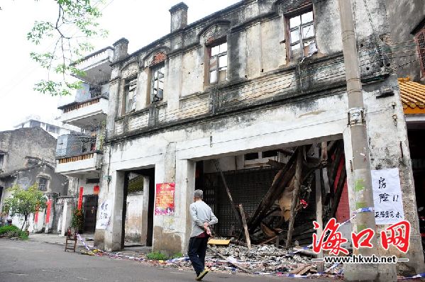 4月3日晚海口振东老街一栋二层百年老屋,在大雨中突然倒塌,幸亏无人伤亡。