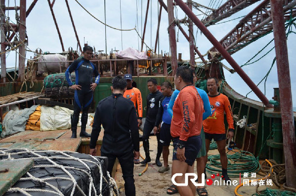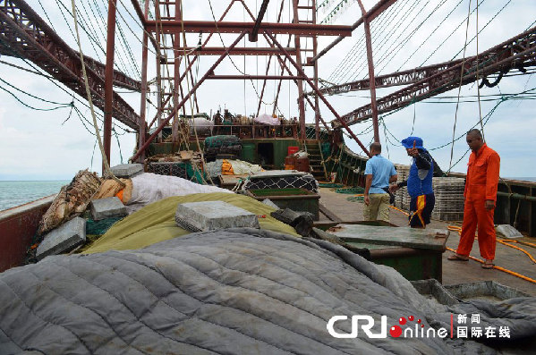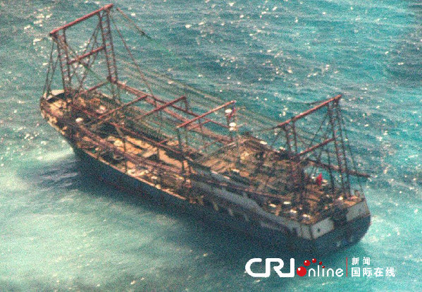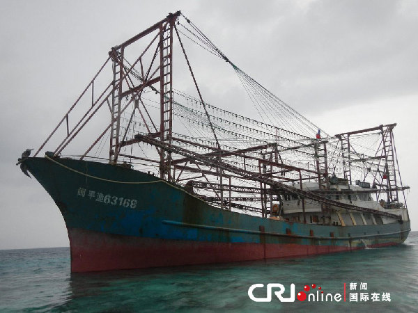 当地时间2013年4月9日,菲律宾海岸警卫队称,一艘“可疑”的中国渔船8日晚在该国西南部的图巴塔哈群礁地区搁浅,12名船员因涉嫌“侵渔”被逮捕。据称,该中国渔船长48米,宽8米,图巴塔哈群礁国家公园的巡查员经过检查发现,这艘渔船上有渔网,但并没有发现鱼类或海洋生物。图巴塔哈群礁管理办公室没收了中国渔民的设备、渔具和船只。菲海岸警卫队和巡查员正在通过潜水作业来调查群礁受损伤的范围,不排除向中国渔船索赔的可能。图片作者:PHILIPPINE NAVY/HANDOUT/CFP