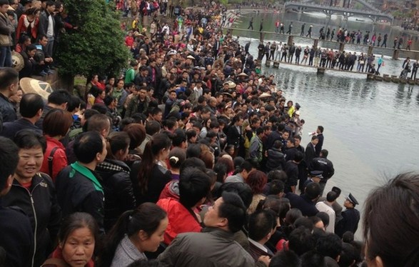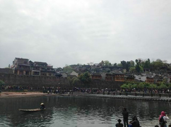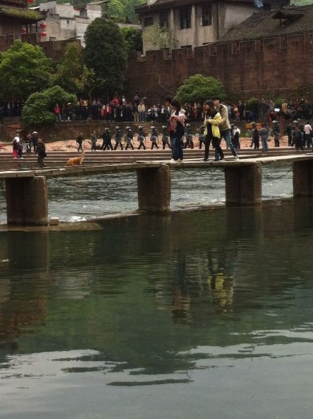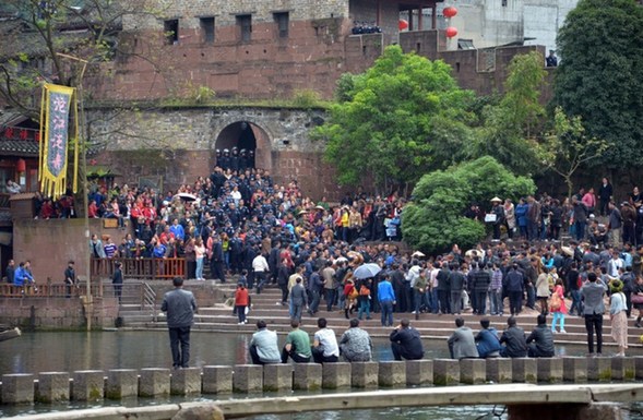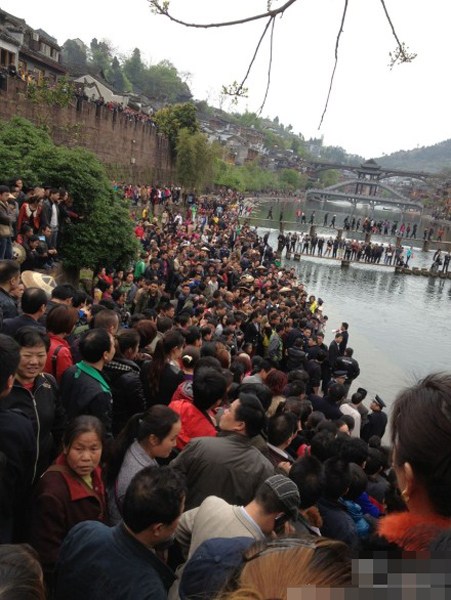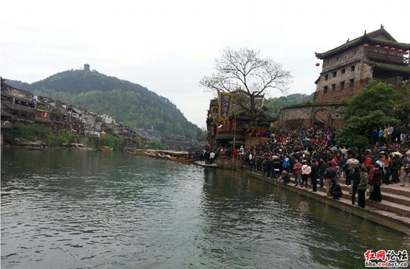 4月11日,凤凰古城,在北门码头围观的游客。