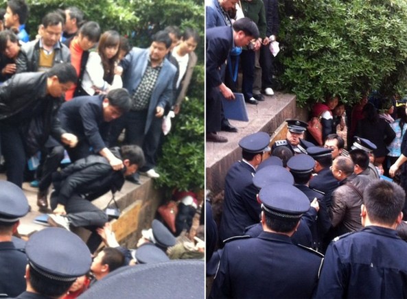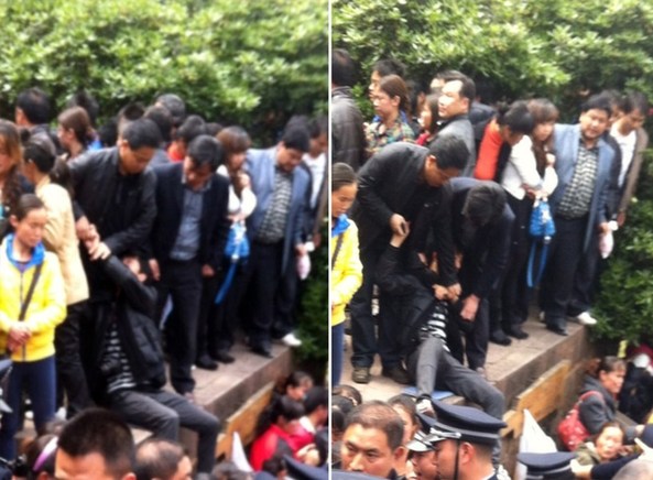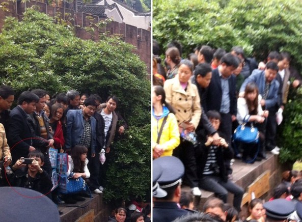 图为事发现场,一男游客拍照发微博被“警察”抢过手机并逮捕。