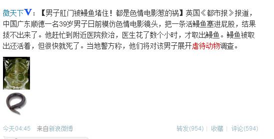 据英国媒体报道,中国广东佛山顺德一名39岁的男子,日前看了日本AV之后,模仿其中的镜头将一条鳗鱼塞进了自己的肛门,结果造成了肠穿孔,医生花了几个小时才把鳗鱼取出。而据悉,这种淫乱方式是三亚海天盛宴高富帅与外围绿茶常玩的把式,或许该顺德男子就是受此不良影响吧。有趣的是,英媒报道此事时附上了”顺德警方将对该男子进行虐待动物调查“。