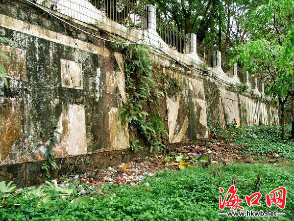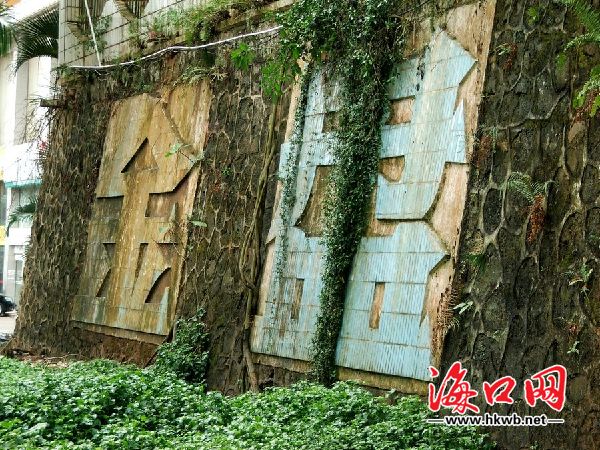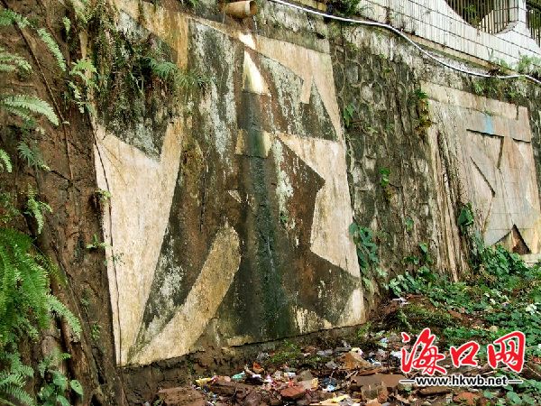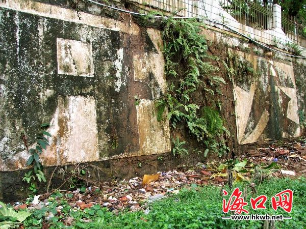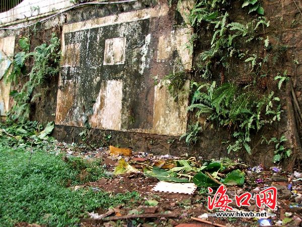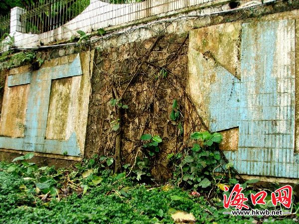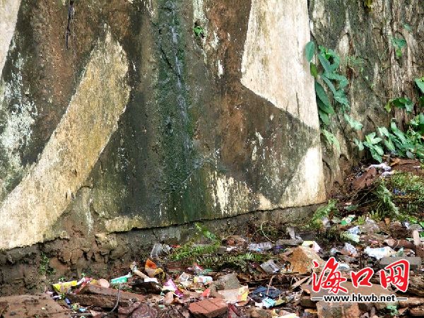 海口南海大道工业开发区污水横流,杂草垃圾随处丢弃.发臭的废水四处排放,使得墙体已经发绿,几十米长的特大字体非常显眼,但散发阵阵恶臭,污秽不堪。如此脏乱的肮脏的形象实在太不应该!