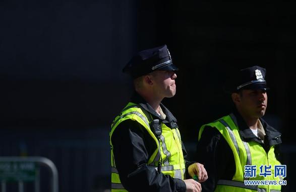 4月17日,在美国波士顿,两名警察在发生爆炸的街区路口封锁现场。当天,多家美国媒体分别援引来自执法机构的消息源说,针对波士顿爆炸案的调查工作已出现重要进展,调查人员已通过图片和视频锁定了一名可能制造波士顿爆炸案的犯罪嫌疑人。截止到当日,爆炸现场仍被封锁,调查工作在持续进行。新华社记者王雷摄