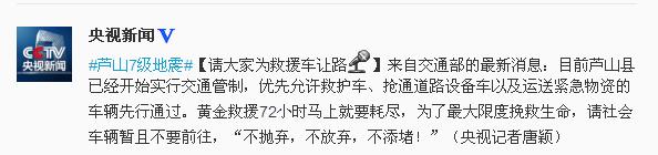 #芦山7级地震#【请大家为救援车让路】来自交通部的最新消息:目前芦山县已经开始实行交通管制,优先允许救护车、抢通道路设备车以及运送紧急物资的车辆先行通过。黄金救援72小时马上就要耗尽,为了最大限度挽救生命,请社会车辆暂且不要前往,“不抛弃,不放弃,不添堵!”(央视记者唐颖)