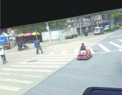武汉大婶驾玩具车横穿马路 吓出过往司机一身汗