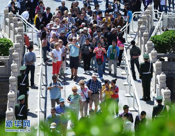 4月29日,游客在北京天安门广场上游览。当日,全国各地群众共度“五一”小长假首日。 新华社发(王全超 摄)