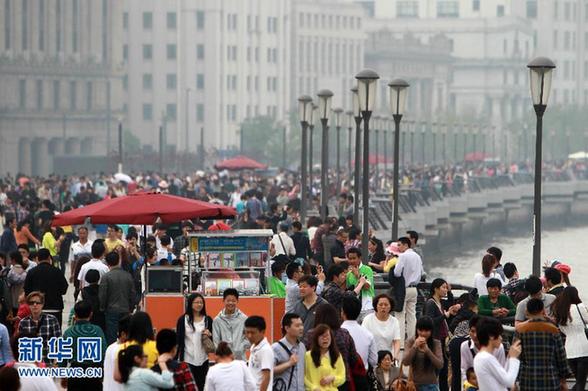 4月29日,游客在上海外滩游览。当日,全国各地群众共度“五一”小长假首日。 新华社发(丁汀 摄)