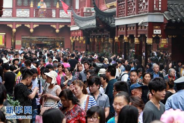 4月29日,游客在上海城隍庙游览。当日,全国各地群众共度“五一”小长假首日。 新华社发(丁汀 摄)