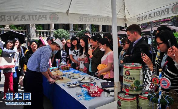 4月29日,游客在天津意式风情区品尝美食。当日,全国各地群众共度“五一”小长假首日。新华社记者 张超群摄