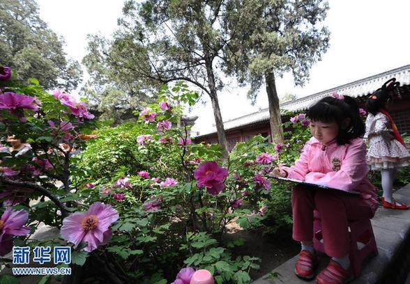 4月29日,一名小女孩在山西省太原市的双塔寺内绘画。近日双塔寺内的六千多株牡丹竞相开放。当日,全国各地群众共度“五一”小长假首日。新华社记者 燕雁摄
