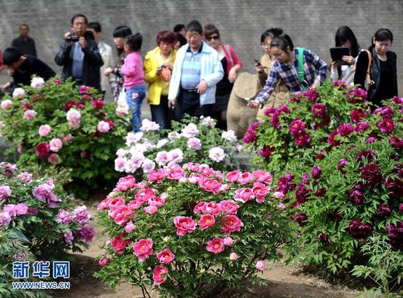 4月29日,游客在山西省太原市的双塔寺内欣赏牡丹。近日双塔寺内的六千多株牡丹竞相开放。当日,全国各地群众共度“五一”小长假首日。新华社记者 燕雁摄