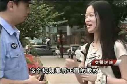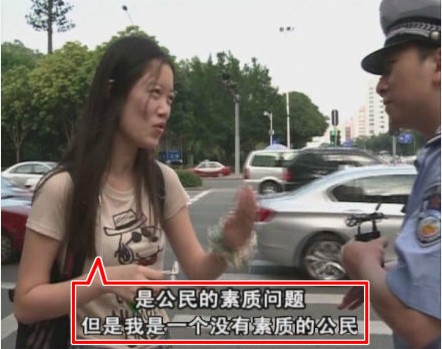 姑娘:我一直都冲红灯;交警:你还好意思说;姑娘:我知道规矩,不应闯红灯,是公民素质问题,但我是没素质的公民,像我这种没素质的人少部分存在就好;交警:今天你是第一个闯红灯被抓;姑娘:太幸运了……我还是会闯的。