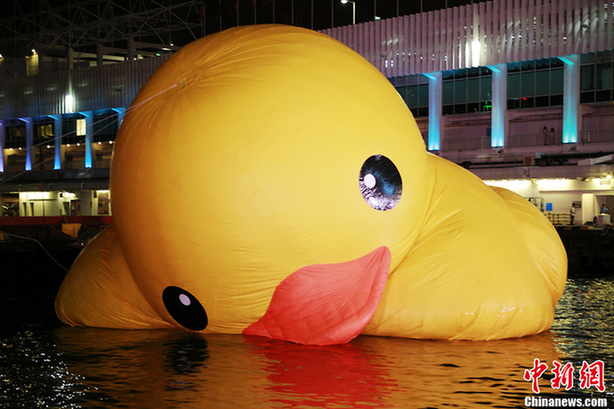 2013年5月21日晚,香港维多利亚港的大黄鸭在工作人员连日来的充气下,已经重新出现在维多利亚港,再展黄鸭雄风。5月14日,维多利亚港水面上的大黄鸭蔫了,引得网友一片哗然,最终竟然成了一张“鸭饼”,让大家觉得又心酸又好笑。随后,记者在采访中从工作人员处得知,大黄鸭是进行例行检查。