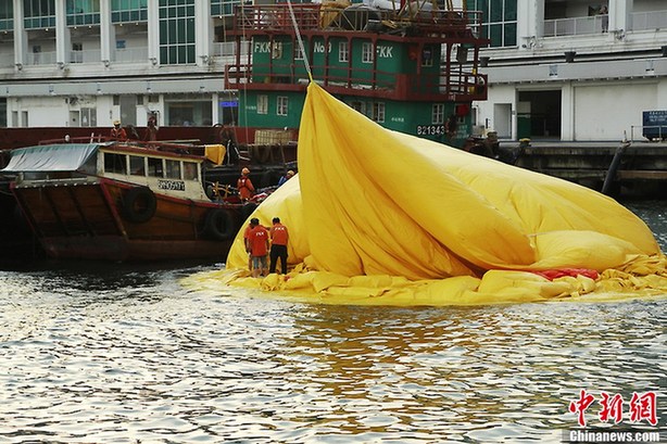 2013年5月21日晚,香港维多利亚港的大黄鸭在工作人员连日来的充气下,已经重新出现在维多利亚港,再展黄鸭雄风。5月14日,维多利亚港水面上的大黄鸭蔫了,引得网友一片哗然,最终竟然成了一张“鸭饼”,让大家觉得又心酸又好笑。随后,记者在采访中从工作人员处得知,大黄鸭是进行例行检查。