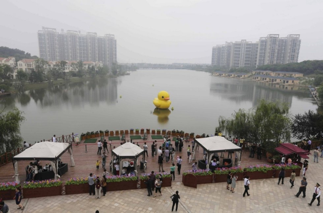 6月1日,迷你版“大黄鸭”现身武汉汉南区一楼盘旁的湖面。有网友质疑“汉版”大黄鸭版权问题。记者了解到,原版大黄鸭拥有版权是无疑的,它属艺术家弗洛伦泰因·霍夫曼所有,霍夫曼也因此被称为“大黄鸭之父”。新华社发