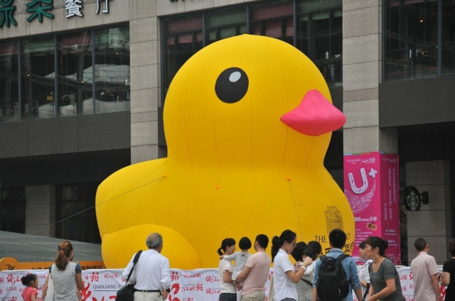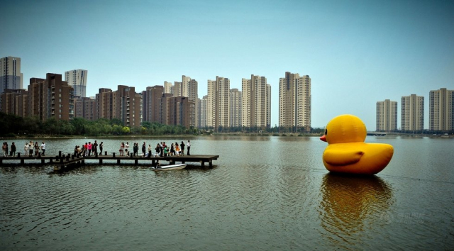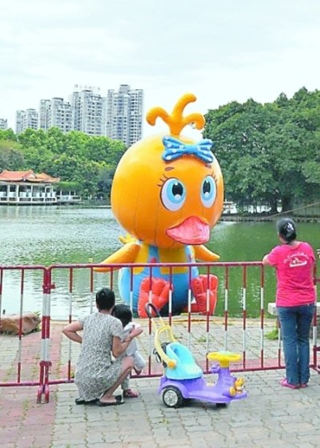 近日,广东东莞冒出了地方版的“大黄鸭”——黄毛鸭,下水后迅速引发网友围观,因为外形奇特,遭来网友各种吐槽。5月29日,这只东莞版的“大黄鸭”出现在市人民公园的人工湖面上。据广州日报报道称,东莞的这只巨型充气鸭玩偶名叫“黄毛鸭”,它同样也是橡皮制造,内部充气后可浮在水面。不过,比起16.5米高的香港“大黄鸭”,“黄毛鸭”身材显得有些袖珍,仅有5米高。图/长江日报