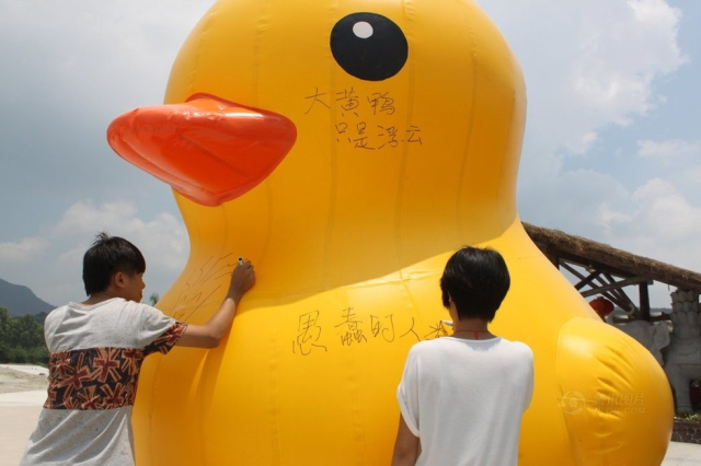 5月30日,广东佛山,游客在高3米的大黄鸭身上写字、涂鸦。这段时间,旅游界有两件事很热门: 大黄鸭与“到此一游”。针对这两大热门事件,高明九寨水城的大黄鸭决定“献身”给喜欢涂画与刻字的游客。摄影:叶爱群