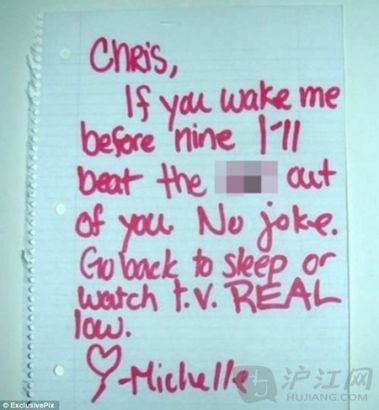 5.克里斯,如果你在九点前吵醒我,我要把你的**打掉,不是开玩笑。回去睡觉或者看电视。