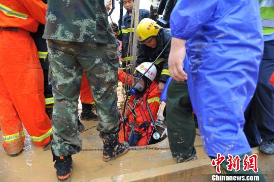 图为6月10日,一名消防官兵下井搜寻后被拖回地面。 洪坚鹏 摄