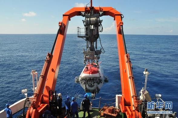 入水的“蛟龙”号载人潜水器(6月28日摄)。