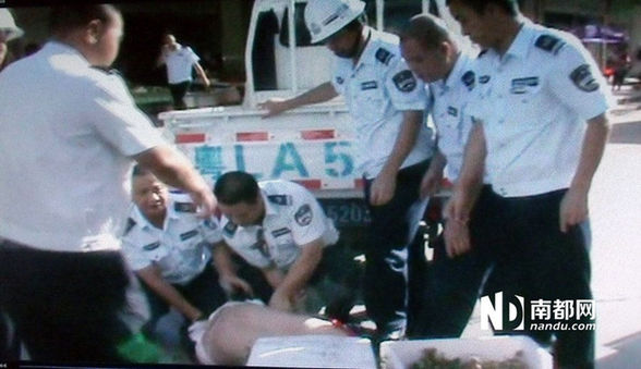 7月2日下午,惠州惠城区河南岸上马庄启明苑门前,城管对一名流动商贩进行检查时,小商贩欲驾车离开,遭城管拔掉车钥匙时,小商贩用剪刀将城管刺伤,而城管在对其制服过程中,造成其胳膊骨折、脑震荡。4日,记者在医院见到,该小商贩与被刺城管均躺在病床上。图为城管被刺伤后,小商贩被几名城管按倒在地。视频截图