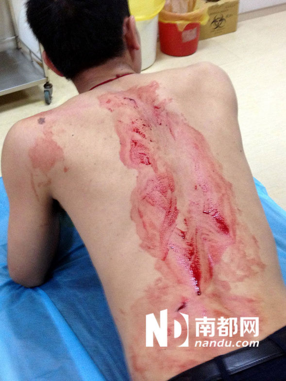 被小商贩刺伤的城管腰部鲜血直流。