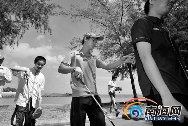 7月5日,在海口市万绿园里,参加初级盲人按摩培训班的学员们在练习盲人定向行走,学会后他们就可以自行走出家门。