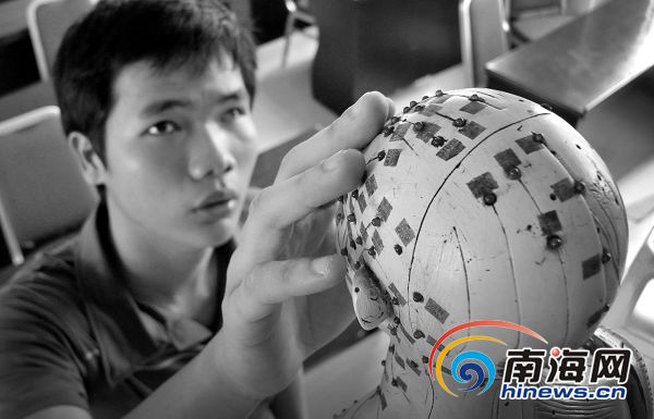 7月6日,在海口市美群路8号海南省盲人按摩指导中心的教室里,许炳花在触摸人体模型上的穴位,人体有722个穴位,以及肌肉、经络分布等,他们需要全部背熟。