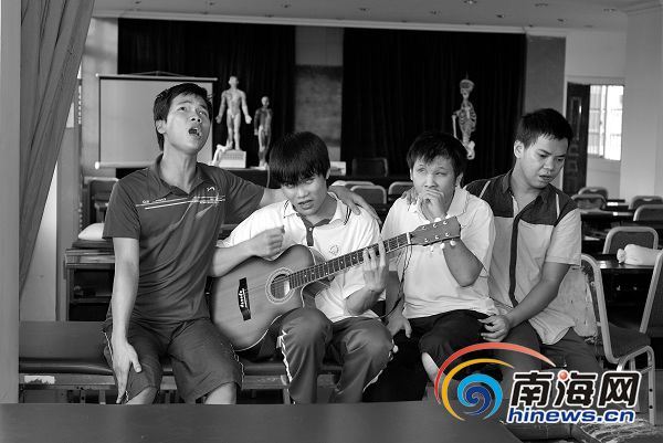 7月6日,在盲人按摩指导中心的教室里,许炳花(左一)、黄小康(左二)、李开来(左三)几个同学在唱歌,在这里,他们多了笑容。