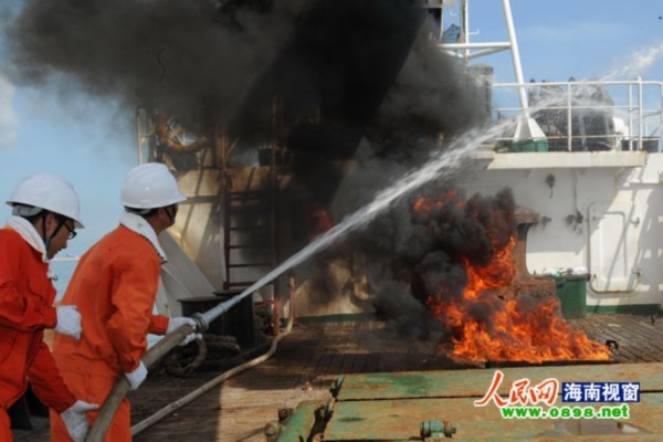 其实,这并不是一起突发事故,而是南海航海保障中心海口航标处举行的一次船舶消防救生演习。
