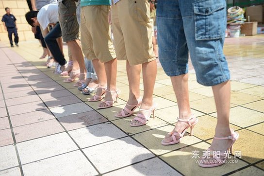 7月28日,恰逢周末,在东莞工作的郭先生带着家人来到华南MALL欢笑天地游玩,烈日下一场男士高跟鞋体验活动正在举办,禁不住妻子和女儿的鼓励,他也穿上了粉色高跟鞋“美”了一回。一双浓密的“飞毛腿”、两只粗犷的大脚与粉红色高跟鞋形成鲜明的对比。女儿拿起手机要给爸爸拍照,郭先生还很配合地比了一个“耶”。70后的郭先生也是当天体验日上年纪最大的男士。