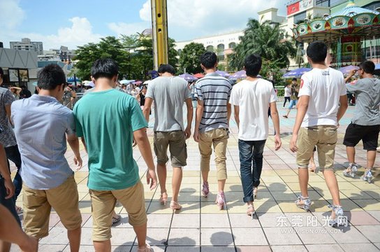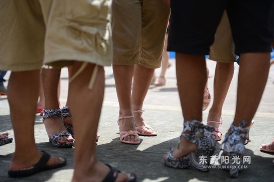 7月28日,恰逢周末,在东莞工作的郭先生带着家人来到华南MALL欢笑天地游玩,烈日下一场男士高跟鞋体验活动正在举办,禁不住妻子和女儿的鼓励,他也穿上了粉色高跟鞋“美”了一回。一双浓密的“飞毛腿”、两只粗犷的大脚与粉红色高跟鞋形成鲜明的对比。女儿拿起手机要给爸爸拍照,郭先生还很配合地比了一个“耶”。70后的郭先生也是当天体验日上年纪最大的男士。