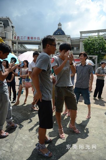 穿上高跟鞋的男士掏出手机,为自己的大反串拍照留念。