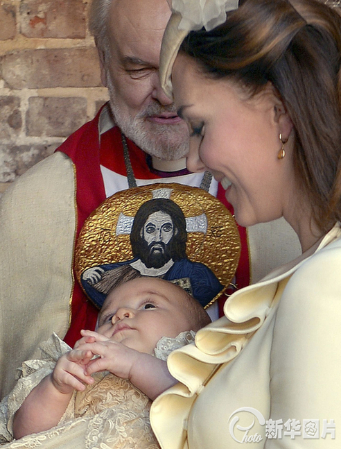 当地时间2013年10月23日,英国伦敦,凯特王妃在受洗仪式完毕后抱着儿子乔治王子。英国乔治王子的洗礼仪式在圣詹姆斯宫的皇家礼拜堂举行。John Stillwell/东方IC