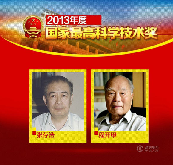 【2013年国家最高科学技术奖得主:张存浩、程开甲】2014年1月10日,国家科学技术奖励大会在人民大礼堂举行。每年不超过两名的国家最高科技奖,是中国科技界的最高荣誉,奖金为500万元。2013年国家最高科学技术奖由物理化学家张存浩和物理学家程开甲获得。(央视记者帅俊全)