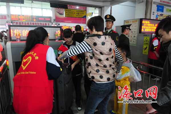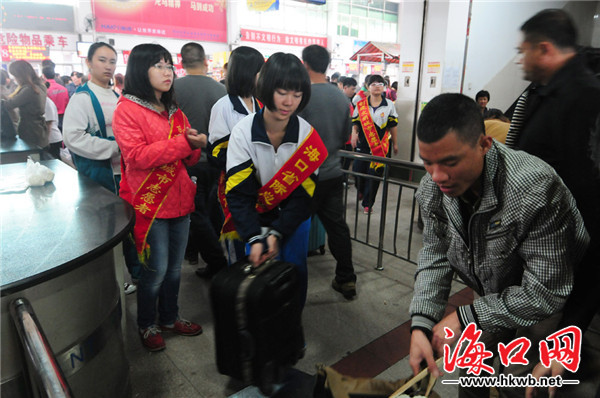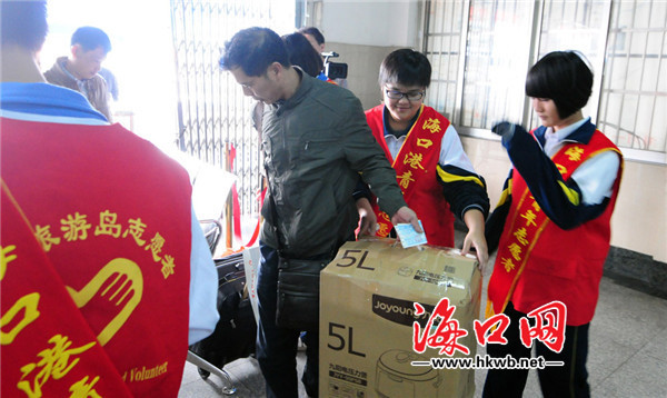 海口网1月27日消息(记者张俊其 通讯员欧阳资)为营造平安、畅通、有序的出行环境,共青团海口市委开展了平安春运志愿服务活动。志愿者们分别在海口市秀英港、汽车西站、东环铁东站等7个客流量较大的站点,帮助老弱旅客运送行李,协助站内工作人员维护站点秩序,为来往乘客提供引导和咨询服务。