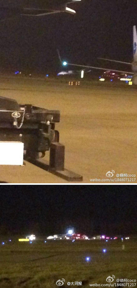 目前,飞机上的人员已经疏散,安监部门正在现场拍照取证,120、119等已经到达现场,郑州机场启动了应急救援程序。
