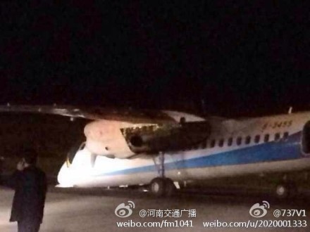 @幸福航空 2014年2月4日下午18:29,幸福航空公司一架飞机在执行太原至郑州的JR1533航班时,在郑州新郑国际机场落地后的滑行过程中,飞机前起落架意外缓慢收起,机头着地。机组人员和旅客共44名,无人员伤亡。