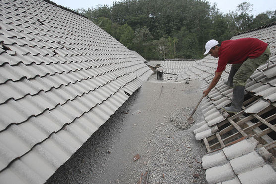 当地时间2月14日,一名男子在清理被火山灰覆盖的屋顶。Trisnadi 摄