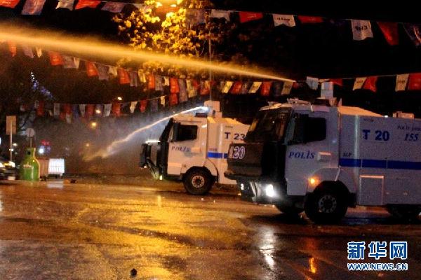 2月25日,在土耳其首都安卡拉街头,警察用高压水枪驱散示威者。