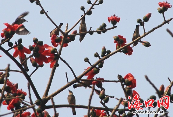 36日下午,在海口市白龙南路美舍河岸边,鸟儿在盛开的木棉花枝间飞舞觅食。